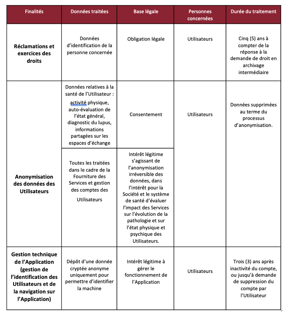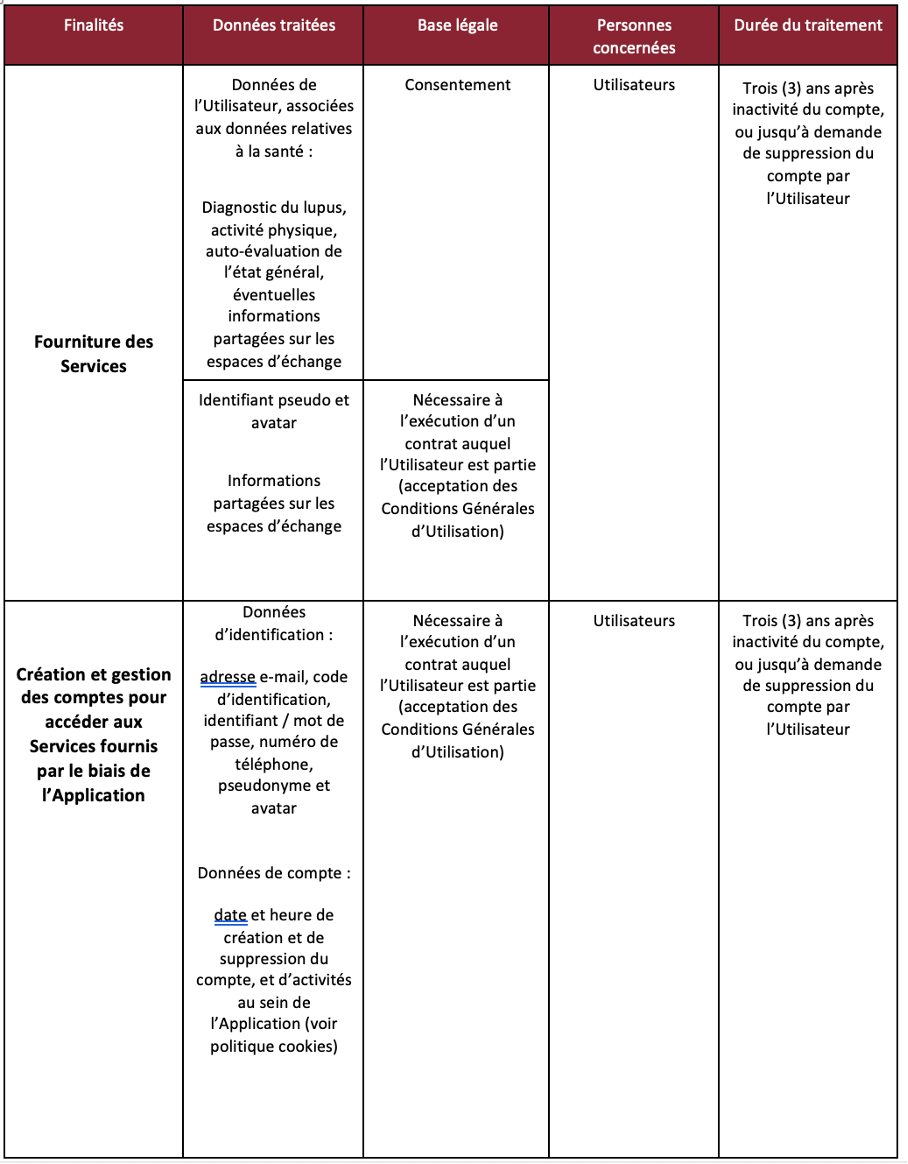 The Application provides, to individuals diagnosed with lupus (the « Users »), a space for exchange with other Users suffering from the same disease, thematic advice, physical activity goals, and monitoring of their overall condition (the « Services »).